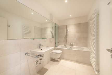 - Modern-puristically designed bathrooms, shower rooms and guest WCs with large-format, light gray Porcelanosa fine stone tiles, large mirrors and branded sanitary objects (Villeroy & Boch, Hansgrohe, etc.)