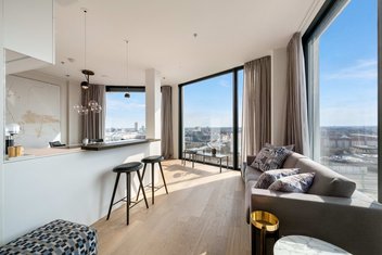 Überwältigende Lichtfülle, ein atemberaubendes Panorama über München bis zu den Alpen und eine exquisite Ausstattung prägen diese Highend-Wohnung. Die absolut ruhigen Räumlichkeiten befinden sich im 14. Obergeschoss des 2016 fertiggestellten Friends Tower No. 1, somit in der obersten Wohnetage unmittelbar unter dem spektakulären Rooftop, das von den Bewohnern dieses Premium-Quartiers exklusiv genutzt werden kann.