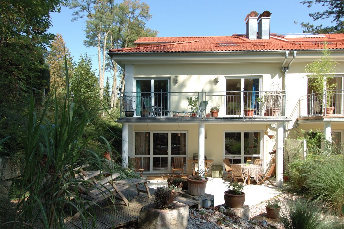 Absolut ruhige Bestlage, charmante Haushälfte mit reizvollem Ambiente und hochwertiger Ausstattung, Parkett - und Natursteinböden, attraktiver Wohn-/Essbereich ca. 43 m² mit bodentiefen Fensterfronten und Kaminanschluss, 4 Schlafzimmer + besonders attraktives Dachstudio, 2 moderne hochwertige Bäder, Hobbyraum ca. 34m², besonders schöne Gartenanlage mit mehreren Terrassen, 2 Carports.